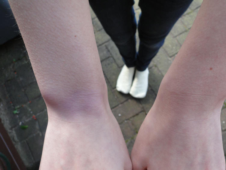 Now it gets even odder Becki came out in a faint purple bruise all around her right wrist Hard to show on a photo, but it goes all the way around her wrist top and bottom. Now I'm her Dad and I know she hate's anything around her wrist, she never wears a watch and even me putting my watch on my wrist goes through her. This isn't a joke and I'm still a sceptic as it wasn't a white misty figure I saw, but I have no explanation for what I did see and very close up with my own eyes
